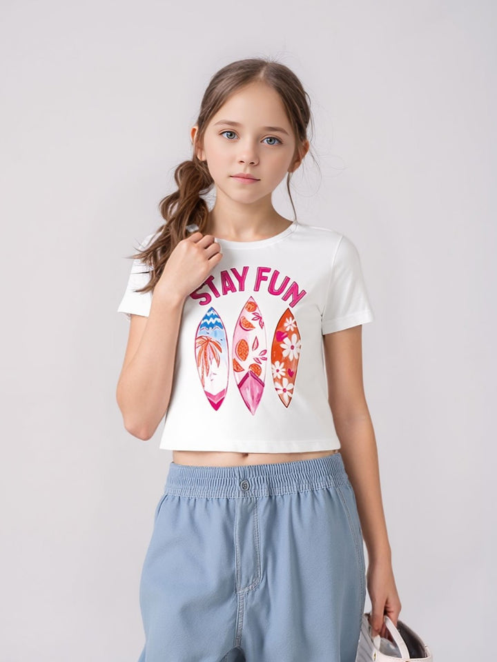 Camiseta oversize crop top para niña con estampado distintivo. Diseño moderno y cómodo que combina tendencia con practicidad. Perfecta para un look casual y versátil.