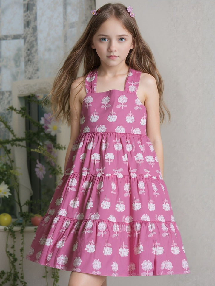 Vestido para niña elaborado en algodón 100%, con vibrante estampado de flores. Las golas ofrecen libertad y movimiento. Tela transpirable ideal para climas cálidos.