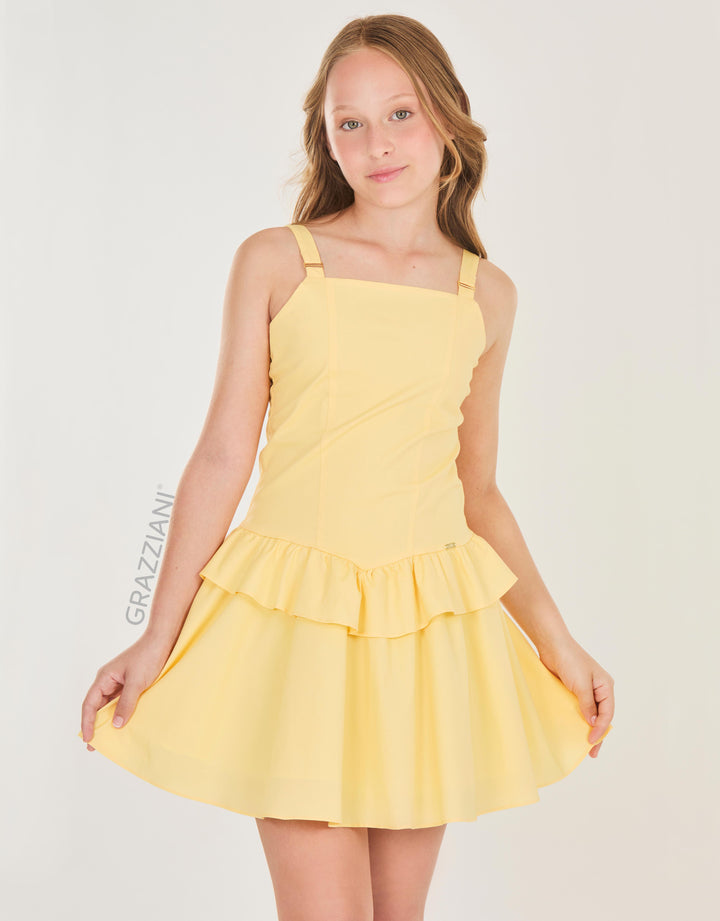 ¡Un vestido amarillo para que tu niña brille! Confeccionado en algodón suave y respirable, este diseño de talle largo ofrece libertad de movimiento, en la espalda con encauchado para mejor ajuste. Las hebillas decorativas en los hombros añaden un toque trendy y divertido para cualquier ocasión especial.